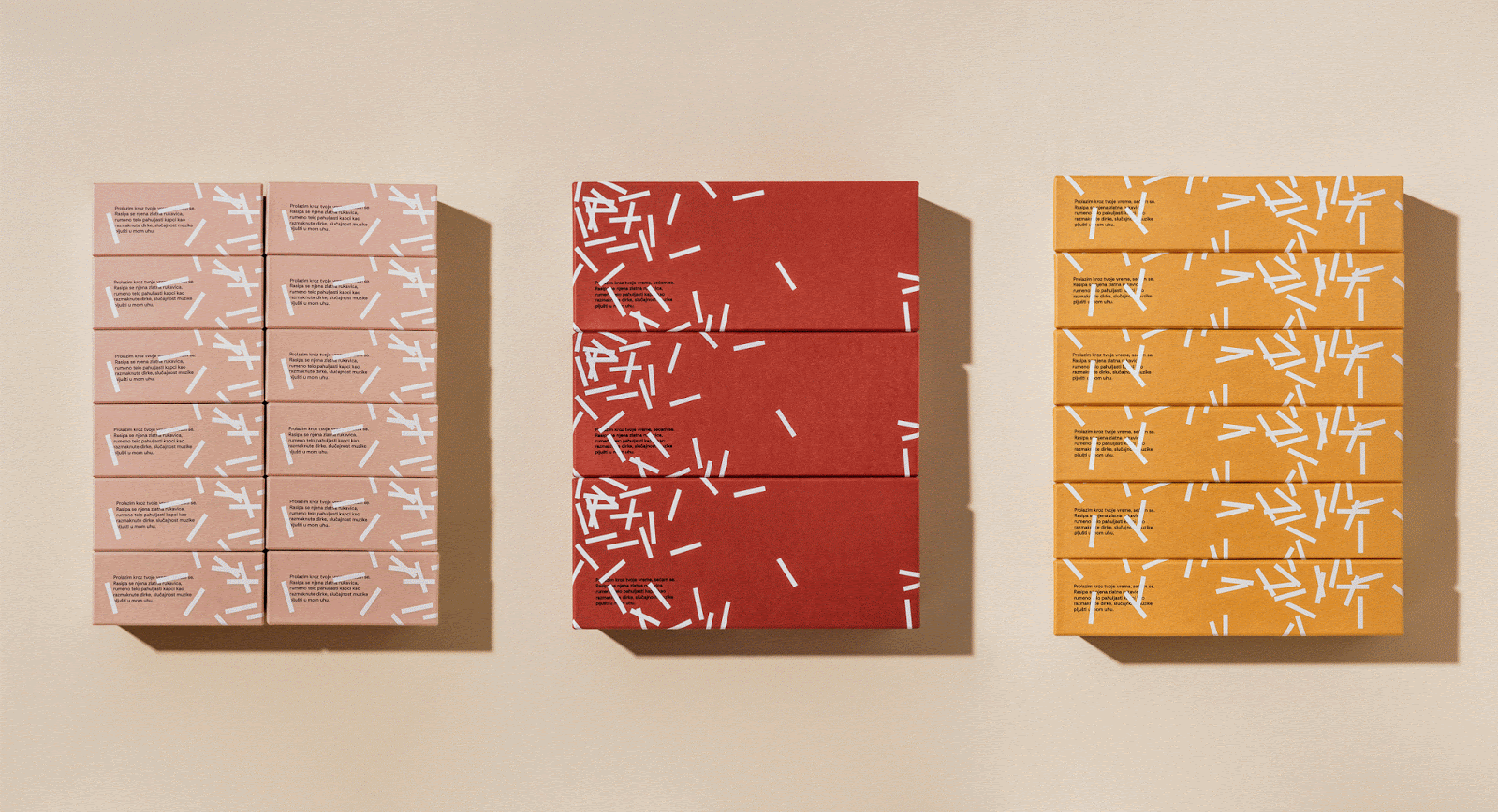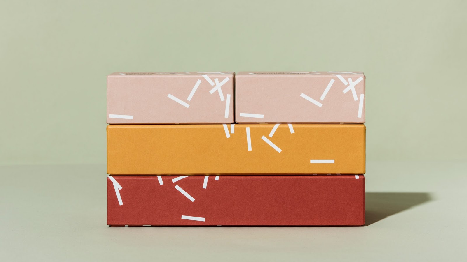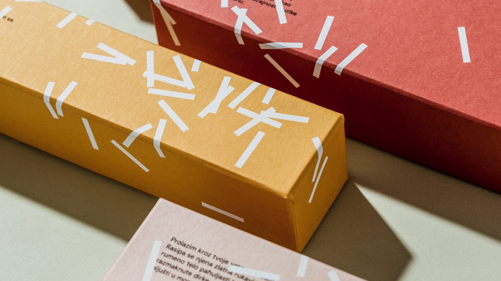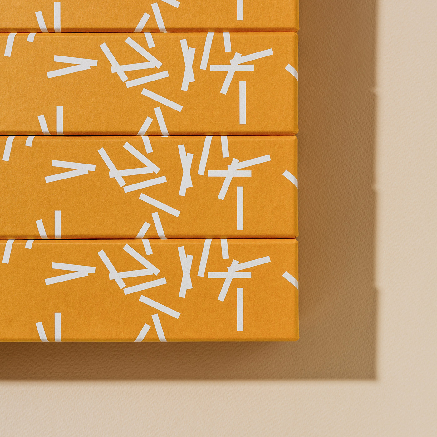 Chiếc hộp được làm bằng các kỹ thuật thủ công truyền thống, giống như các món tráng miệng mà nó chứa. Màu sắc là đất nung tự nhiên, sắc thái vàng và hồng, trong khi các vần in trên đầu hộp gợi lên sự tiếp xúc đầu tiên giữa môi và món tráng miệng.