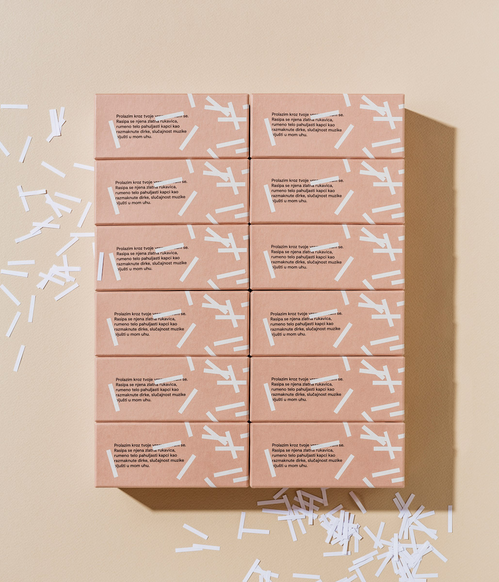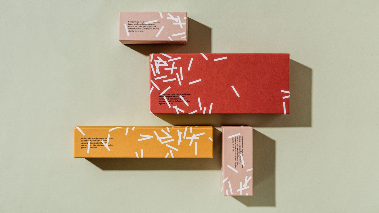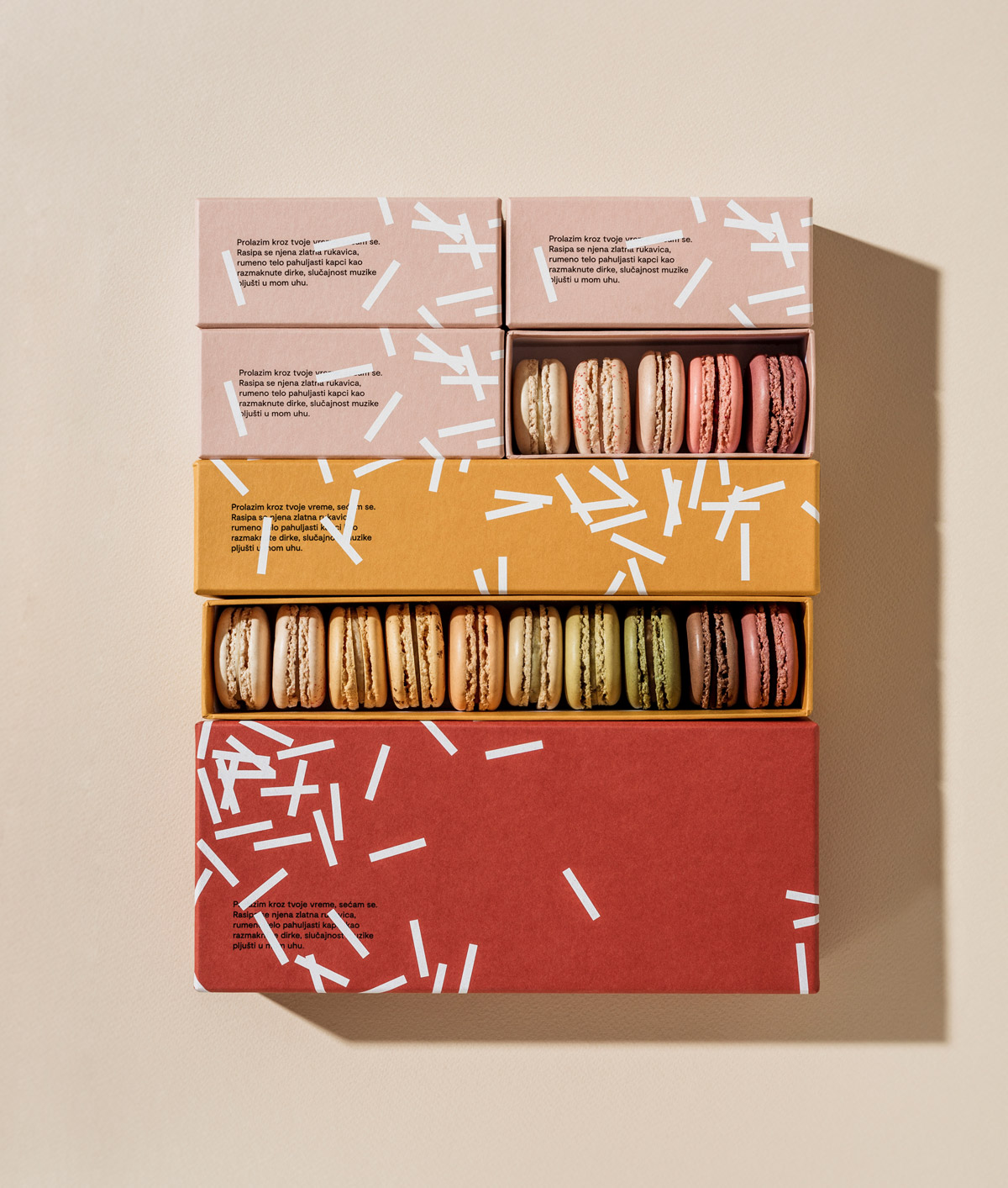 Fini là một trong những cửa hàng bánh ngọt nổi tiếng nhất Belgrade, nổi tiếng với bánh macaron của Pháp. Ý tưởng thiết kế đã tạo ra các hộp quà cho hai mươi, mười và năm chiếc bánh macaron, giống như một bức ảnh chụp từ một bữa tiệc, đưa khách hàng trở lại khoảnh khắc tháo gỡ món quà và được tắm bằng confetti.