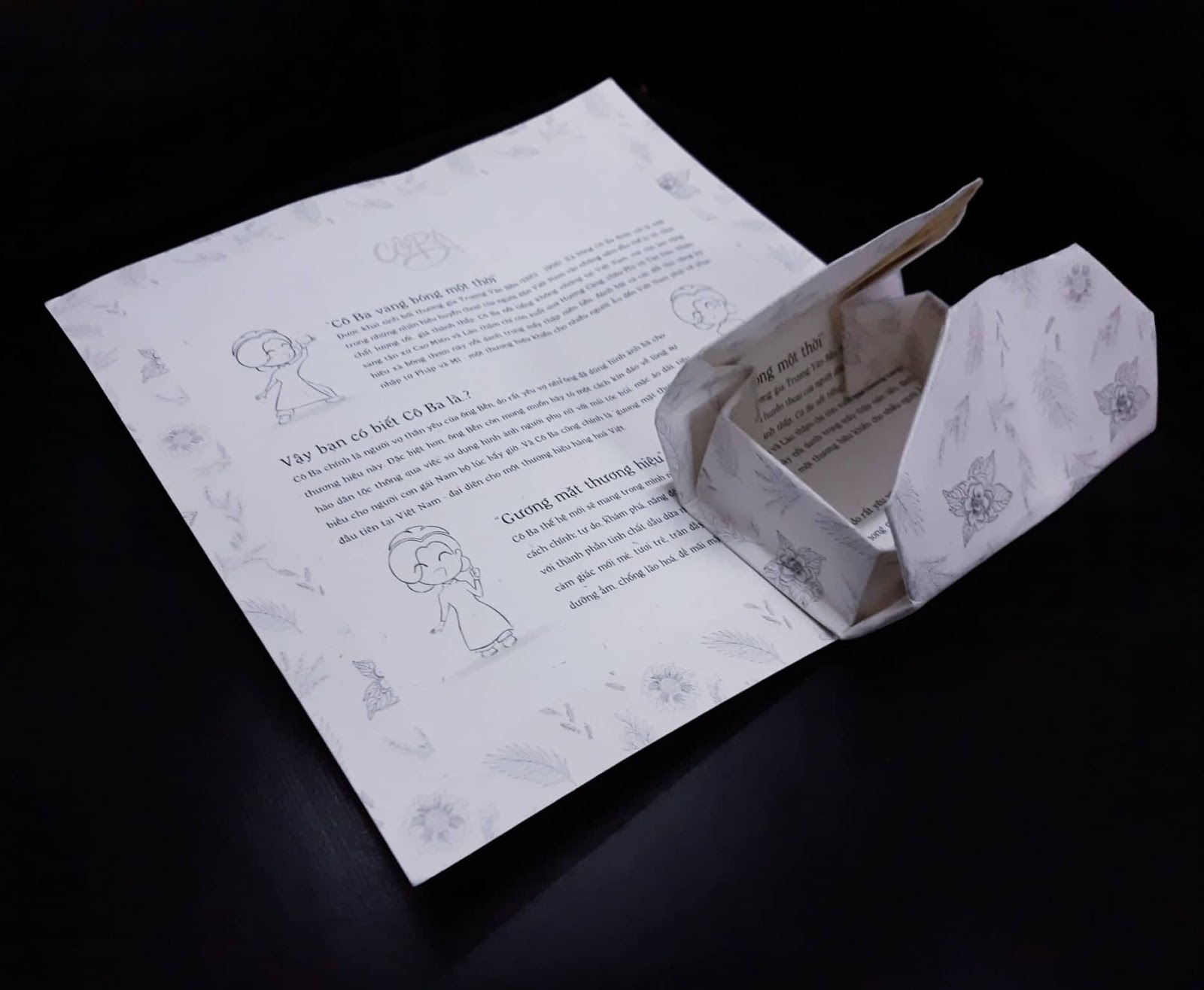 Trên bao bì cũ, có một hình ảnh thực sự của một người phụ nữ được gọi là "cô ba" ("Hoa hậu ba"), mang "áo dài" với những đặc điểm tóc nổi bật của phụ nữ miền Nam Việt Nam vào đầu thế kỷ 20. Để tái thương hiệu thương hiệu này, thiết kế lại hình ảnh người phụ nữ này bằng cách sử dụng vector để tạo ra hiện đại, cũng là sự linh hoạt của logo với mái tóc được lấy cảm hứng từ lá cây dừa. Hơn nữa, ý tưởng cố gắng để thay đổi cấu trúc của bao bì, bằng cách sử dụng "Origami" cấu trúc với tài liệu giấy Eco, bao bì mới có thể tạo ra bản chất và "khám phá" cảm giác ở người tiêu dùng khi họ mở nó và sau đó họ có thể xem thông tin lịch sử bên trong.